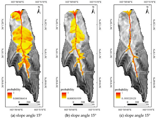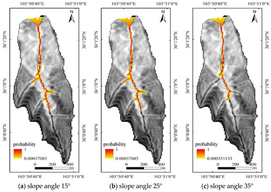 The effect of critical terrain slope for source area identification was analyzed with the 10 m resolution DEM data. Three critical terrain slope thresholds of 15°, 25°, and 35° were analyzed separately to identify flood source areas without considering the effect of landslides from avalanches. It was found that areas smaller than this slope were excluded from the potential source area due to the increase in the source area initiation slope threshold, as shown in Figure 12 and Figure 13. Thus, as the critical terrain slope for source area identification increased, the identified source areas gradually decreased. In addition to some of the source areas in the upstream branches of the main ditch, some of the source areas in the middle and lower reaches of the ditch were also controlled by topographic features and could not be well identified when the source area initiation slope threshold was large. When the source area initiation slope threshold increased, the material that can undergo flow decreased, and the range and distance of movement spreading were relatively reduced. The evaluated disaster-prone area may be too small, and the obtained hazard evaluation was not reasonable.