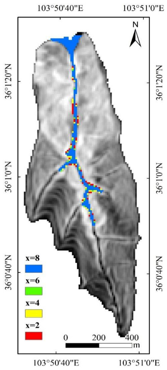The motion paths and distances of the same material source are often constrained by potential energy, topography, and other conditions, even if the same material source area often has different motion diffusion paths and diffusion ranges under different conditions. The motion diffusion path in the model is mainly controlled by the index x in the Holmgren model, and the four values of x were selected as 2, 4, 6, and 8, respectively, to analyze the influence of the index x in the Holmgren model on the motion process for the raster data with 10 m resolution. Figure 16 shows the spreading process of debris flow under the influence of both collapse and landslide, and it was found that the spreading range tended to decrease and the flow rate converge rapidly with the increase in the index x. Figure 17 shows the spreading range of motion of the flood, and it was similarly found that as the exponent x became smaller, its spreading range to both sides of the channel became wider. The two results reflected that the index x in the Holmgren model mainly affected the degree of diffusion to both sides during the movement process, and when the index x was larger, the diffusion range was larger, all other conditions being equal. The index x in the model is an indirect reflection of the representation of the way of motion diffusion. The model is based on a simple energy balance and, to a certain extent, can represent the energy of the moving material, and so the greater the energy of the moving material, the wider the path of motion, with a greater range of diffusion.