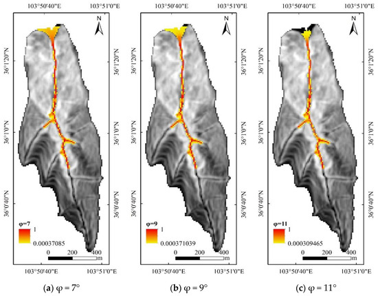 Because a large number of international studies have concluded that the value of this parameter is mostly in the range of 7~11°, three angles of 7°, 9°, and 11° were selected for comparative analysis, and the simulated flood hazard evaluation under the consideration of rainfall surface runoff only is shown in Figure 18. It was found that the maximum movement distance decreased as the angle increased. It was found that when the angle of arrival was set to 11°, the maximum movement distance had not reached the gully entrance and the movement process had stopped. By contrast, when the angle of arrival was set to 7°, the kinetic energy at the mouth of the ditch was not yet fully dissipated and would move further northward out of the ditch until the kinetic energy was reduced to 0, stopping the flow buildup to form a stacked fan. The results of the debris flow hazard evaluation under the consideration of the impact of landslide of avalanche are shown in Figure 19. Large numbers of material sources provided sufficient energy, and the debris flow still flowed out of the gully even when the arrival angle was set to 11°, but the comparison revealed that the energy at the mouth of the gully decreased compared to that at 7° and 9°, and it could be deduced that after flowing out of the gully, it had the shortest distance to move. Since the SFLM model is based on a simplified energy balance, the larger angle represents that the energy loss due to friction is also serious. Therefore, this parameter has a certain physical basis and has better practicality. When the particles of the debris material are rough and the friction between the particles is enhanced, the angle tends to be larger and the distance of movement is shorter.