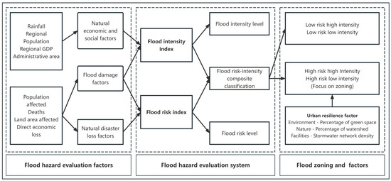 The frequency of global floods has increased, posing significant threats to economic development and human safety. Existing flood risk zoning studies in disaster prevention lack integration of the natural–economic–social chain and urban resilience factors. This study addresses this gap by constructing flood disaster risk and intensity indices using data from 31 provinces and 295 prefectural-level cities in China from 2011 to 2022. These indices incorporate natural (rainfall), economic (GDP), and social (population, built-up area) indicators to assess the flood likelihood and loss degree, providing comprehensive risk and intensity ratings. The study also examines the impact of resilience factors—environmental (green space), infrastructural (rainwater pipeline density), and natural resource (watershed areas)—on flood intensity. Findings reveal that high-risk regions are mainly in the Yangtze River Basin and southern regions, while high-intensity regions are primarily in the middle and lower Yangtze River and certain northwestern cities. Increasing rainwater pipeline density mitigates flood impacts in high-risk, high-intensity areas, while expanding green spaces and pipelines are effective in high-risk, low-intensity regions. This paper proposes a comprehensive flood hazard zoning mechanism integrating natural, economic, and social factors with urban resilience, offering insights and a scientific basis for urban flood management.