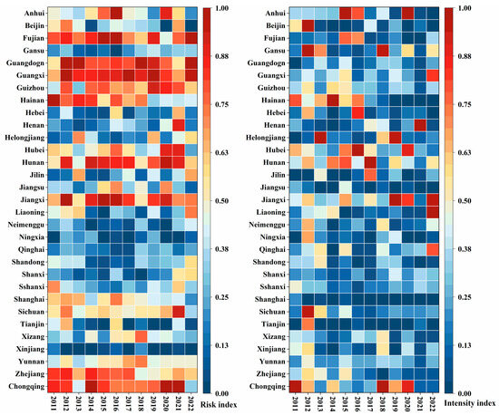 Heat map of flood disaster risk index and flood disaster intensity index of all provinces in 2011–2022.