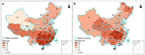 Flood disaster risk-intensity grade diagram. In which, (a) is a map of the national flood risk scale and (b) is a map of the national flood intensity scale. BJ—Beijing, TJ—Tianjin, HE—Hebei, SX—Shanxi, IM—Inner Mongolia; HL—Heilongjiang, JL—Jilin, LN—Liaoning; SH—Shanghai, JS—Jiangsu, ZJ—Zhejiang, AH—Anhui, FJ—Fujian, JX—Jiangxi, SD—Shandong; HA—Henan, HB—Hubei, HN—Hunan; GD—Guangdong, GX—Guangxi, HI—Hainan; CQ—Chongqing, SC—Sichuan, GZ—Guizhou, YN—Yunnan; SN—Shaanxi, GS—Gansu, QH—Qinghai, NX—Ningxia, XJ—Xinjiang; XZ—Xizang, HK—Hong Kang, MO—Macao, TW—Taiwan.