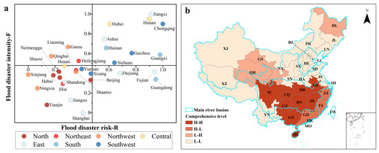 In this study, we developed a comprehensive provincial flood hazard zoning framework by integrating the flood risk index (R) and the flood intensity index (F). The average values of the flood risk index (R) and flood intensity index (F) across provinces, recorded at 0.47 and 0.48, respectively, served as the reference points for this zoning classification. Provinces exhibiting a flood risk index (R) exceeding 0.47 were classified as high-risk areas, whereas those with an index below 0.47 were classified as low-risk areas. Similarly, provinces with a flood intensity index (F) greater than 0.48 were designated as high-intensity areas, and those with an index below 0.48 were categorized as low-intensity areas. Consequently, the study area was stratified into four distinct categories: high-risk and high-intensity (H-H), low-risk and high-intensity (L-H), low-risk and low-intensity (L-L), and high-risk and low-intensity (H-L), as depicted in Figure 5.