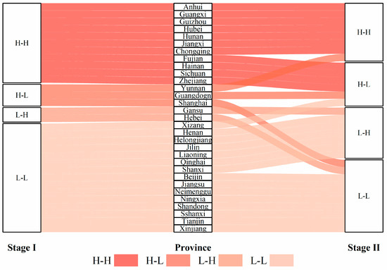 Notably, Fujian, Hainan, Sichuan, and Zhejiang continue to face high risk, but have shown reductions in disaster intensity. This trend warrants further study to gain insights from their management strategies that have successfully reduced flood intensity. Meanwhile, Shanghai and Hebei, initially categorized as high-risk, high-intensity regions in the first stage, transitioned to low-risk, low-intensity (L-L) regions in the second stage, likely due to improvements in flood control infrastructure or emergency response capabilities, suggesting a decline in flood risk and intensity.