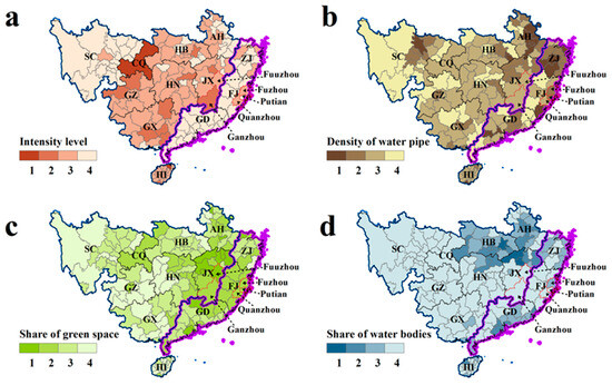 Analysis of flood intensity zones reveals notable discrepancies in flooding intensity ratings among prefecture-level cities within the same province, attributed to variations in urban resilience indicators. For instance, within Fujian Province, categorized as a high-risk, low-intensity region, Quanzhou exhibits a higher flood intensity rating compared to Putian. This difference primarily stems from Putian’s significantly higher rainwater pipe density (6.45 km/km2) compared to Quanzhou (3.15 km/km2), despite both cities having equivalent ratings for built-up area green space percentage and share of water bodies. A similar pattern is observed in high-intensity, high-risk areas; for example, in Jiangxi Province, Fuzhou City and Ganzhou City, despite having identical rankings for rainwater pipe density and share of water bodies, show a disparity in flood intensity due to Fuzhou City’s greater built-up area green space percentage (44.12%) compared to Ganzhou City (41.03%). The data results show a stronger intensity of flood damage in Ganzhou.