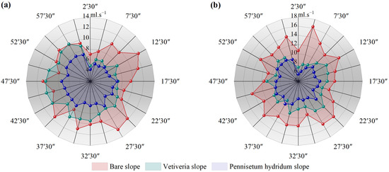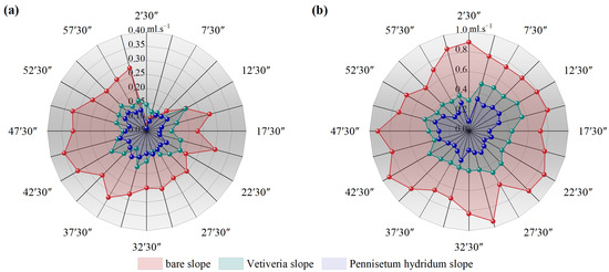 - The runoff generation rate, sediment production rate, and cumulative runoff and sediment production of the three types of slopes under different gradients all show the trend of bare slope > Vetiver grass slope > Pennisetum hydridum slope. This indicates that both herbaceous plants have good soil and water conservation effects, and Pennisetum hydridum’s soil and water conservation effect is significantly better than that of Vetiver grass.