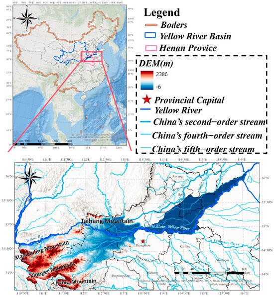 The location of Yellow River Basin in Henan province and corresponding river systems.