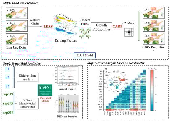 This study adopted a research framework consisting of three main components, as shown in Figure 3. Firstly, the LEAS and CARS modules in the Markov chain and PLUS model were used to quantitatively simulate land use/land cover change demand under two different scenarios. Secondly, the water yield module of the InVEST model was employed to forecast various land use scenarios and different meteorological scenario. Finally, Geodetector v1.0-5 was utilized to analyze the influence of each driving factor on water yield and the interaction between these factors.