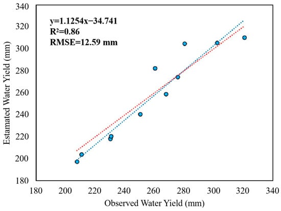 The average water yield estimated in the Water Resources Bulletin was compared with the observed water yield (the blue dotted line is the fitting curve; the red dotted line is the 1:1 curve).