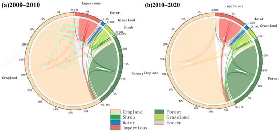 The visualization of land use transfer matrix: (a) land use transformation, 2000–2010; (b) land use transformation, 2000–2010.