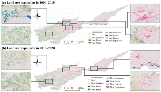Land use changes during each period were analyzed and are presented in Figure 4. The distribution of land use in the Yellow River Basin of Henan Province was described for the periods 2000–2010 and 2010–2020. Land use types included cropland, impervious land (construction land), forest land, grassland, water, shrubland, and barren land. From 2000 to 2010, significant changes in land use occurred, particularly in the conversion of cropland, which amounted to 2592.73 km2. Approximately 50.01% of this transferred cropland was converted to impervious land, 28.29% to forest land, and only 0.34 km2 to barren land (Figure 5a). During the period 2010–2020, the conversion of cropland remained significant, totaling 2293.34 km2. During this period, impervious land had the highest conversion rate, accounting for approximately 56.30% of the total conversion (Figure 5b).