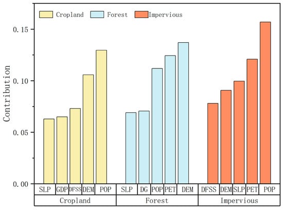 The LEAS module can randomly extract transformation samples of land use expansion areas for training, mine land transformation rules based on random forest algorithms, and obtain the development probability and contribution of driving factors of various types of land use. The calculation formula is shown in Equation (5):