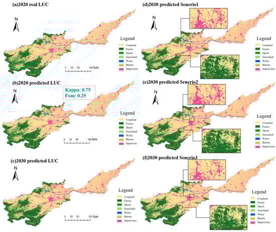 For future scenarios and the results of scenario simulations under different strategies, compared to the forecasts for 2030, the differences in forecast results across scenarios are not significant, with only some patches showing trends of expansion and contraction. In fact, according to previous studies [], land use in Henan Province has been regionally stable, which is similar to the results of this study. However, of the three scenarios, Scenario 3 may be more inclined to actual future land use change. In Scenario 3 of this study, the simulated cropland area slightly expanded, while other types of land use remained essentially the same as in 2020, which actually corresponds more closely to the realistic future land use change scenario. This is different from the research of Ji et al. [] and Zhao et al. []. In their study, the cultivated land area still continues to decrease under the cultivated land protection scenario, which is related to the stricter rules of land use transformation set in our model. With the slowing of China’s economic development and the delineation of China’s agricultural land redline, Henan Province, as one of China’s most important agricultural provinces, has seen increasing national emphasis on the protection of arable land; thus, the arable land in the Yellow River basin of Henan Province will certainly not continue to decrease as per previous trends []. For scientific research and land management, more attention should be paid to the impact of the survival and expansion of cultivated land area on the ecosystem and water resource management in Henan Province.