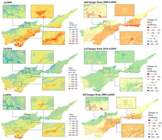 Water yield is a highly complex system, and studying the changes in land use function and value is a method to understand the entire water yield system and its functional patterns []. Based on the land use change conversion matrix in Section 4.1.1 for the years 2000–2020, we found that the area of arable land was 22,105.7 km2 in 2000, which decreased to 20,443.6 km2 by 2020, with a total reduction of 7.5%. The change in arable land was the largest among all types of land use. The reduction in arable land was mostly converted into construction land and forested areas, mainly due to the recent intensification of urbanization and the implementation of policies to convert farmland back to forest in China []. For the years 2000–2020, which were the fastest growing for both China and Henan Province, the conversion of arable land to construction land was the main trend, with construction land increasing by 47.9% over 20 years. This land use transformation process is consistent with that of Henan Province in previous studies []. According to previous studies and the results of this research [], the water yield from construction land is significantly higher than from other land use types, and thus is certain to have an impact on water yield. For the years 2000–2020, which were the fastest growing for both China and Henan Province, the conversion of arable land to construction land was the main trend, with construction land increasing by 47.9% over 20 years. According to previous studies and the results of this research [], the water yield from construction land is significantly higher than from other land use types, and thus is certain to have an impact on water yield. On a regional scale, the quantity of land use change over the past twenty years was 12.2%, and the average regional water balance change due to land use alteration does not exceed 3%, suggesting that changes in land use may not significantly affect regional water yield. However, on a smaller scale, these changes in land use are quite significant, as demonstrated in this study by the notable expansions of the urban areas of Luoyang and Sanmenxia.