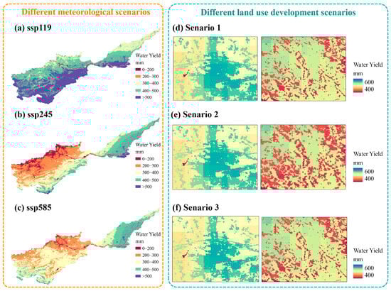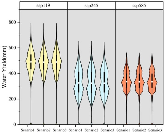 The water yield in the study area is primarily controlled by precipitation, consistent with the calculation method of the InVEST model and the inherent meaning of water yield. The magnitude of water yield is directly influenced by precipitation, evapotranspiration, and their balance. The results of this study also confirm this conclusion, showing that water yield in the study area is controlled by annual precipitation. The differences in water yield caused by different CMIP6 data are much greater than those caused by different land use development scenarios. Within a limited time scale, the water yield in this region is mainly controlled by driving factors such as precipitation and evapotranspiration. The study of Shirmohammadi et al. [] also confirmed that the change of climate conditions is much greater than the change of land use for the change of water yield, which is similar to the results of this study. However, according to subsequent Geodetector analysis, besides precipitation (PRE) as the dominant indicator, natural factors and social factors (such as GDP and population (POP)) show a strong correlation. This indicates that water yield in the study area is determined by a combination of climatic natural conditions and intrinsic social and economic factors (citation), with social and economic factors directly influencing land use types. Previous studies have demonstrated the critical impact of land use types on water yield [,]. Changes in land use/cover types directly or indirectly affect water yield by altering the structure and type of the underlying surface. Additionally, soil porosity, soil texture, and structure have an indirect impact on water yield [,,]. In this study, the differences under different land use development scenarios are not significant, mainly because the Yellow River Basin in Henan Province, as one of China’s most important grain-producing areas and one of the most densely populated regions, has stabilized in terms of land use development. On a regional scale, the land use changes in different scenarios are minimal, and water yield is unlikely to be affected by different scenarios. However, on a longer time scale, significant differences in scale may have some impact on water yield, especially on a local small scale. Lang et al.’s [] research shows that under the scenario without climate change, land use conversion leads to a 0.46% decrease in water production; under the scenario without land use change, climate change leads to a 17.50% increase in regional water production due to precipitation, a conclusion similar to our study. Therefore, in future water resource management, the Yellow River Basin in Henan Province should pay more attention to the impacts of climate change and the potential changes in water yield caused by land use changes on small scales (such as county and city levels).