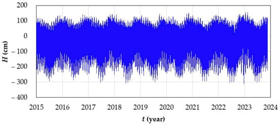 The study area is influenced by prevailing northeast winds, resulting in a net longshore sediment transport (LST) from northeast to southwest. This has led to the elongation of the Loc An sand spit and a tendency for the river mouth to shift southwestward. The waves, predominantly from the east-northeast direction, with significant heights ranging from 1.51 m to 3.0 m, generate longshore currents that drive sediment transport along the coast in the northeast-to-southwest direction []. As the Loc An estuary is located along the East Sea of Vietnam, the semi-diurnal tide also plays a role in the morphological changes of the estuary. Information on the tidal conditions is shown in Figure 2. Here, the water level is measured at the Vung Tau Oceanographic Station, which is located approximately 30 km southwest of the Loc An estuary (see Figure 1).