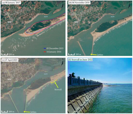 Finally, the shoreline was bounded by both a jetty and a seawall, as seen in Figure 4c. The seawall is clearly visible in Figure 4d, which was taken during June 2022. It should be noted that a groin was constructed eastward of the seawall using geo-tubes to prevent beach erosion along the Loc An sand spit. However, this groin was destroyed within a few months of its construction. As a result, the seawall was built to stabilize the shoreline (Figure 4d).