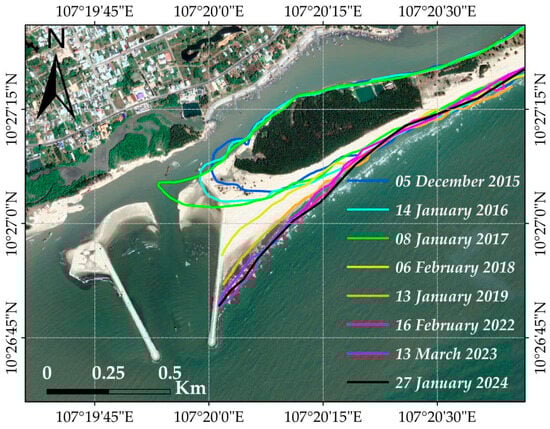 The shoreline changes of the Loc An sand spit from 2015–2023 are presented in Figure 5. As can be seen in Figure 5, the shoreline evolution of Loc An can be divided into three stages. The first stage corresponds to the elongation of the sand spit because of longshore sediment transport with no constraint from coastal structures. This stage includes the shorelines on 17 January 2015, 20 January 2016, and 6 January 2017.