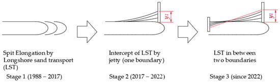 In the second stage, the jetties were constructed (Figure 4b) to stabilize the river mouth. At this stage, the LST was intercepted by the eastward jetty, leading to the accumulation of sand and the seaward advance of the shoreline adjacent to the eastward side of the jetty. According to satellite images, the eastward jetty was constructed in 2017, and the westward jetty was constructed in 2018. The construction of the jetties has caused a change in the direction of the river flow from westward (1988 to 2017) to southward (2018–present). This directional change in river flow can cause sand to bypass to the east side of the jetty and contribute to the buildup of sediment immediately eastward of the jetties.