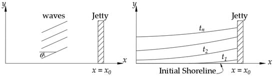 Equation (6) requires a straight shoreline as the initial condition for the calculation (Figure 13). This condition cannot be met with the Loc An sand spit because the shoreline at Stage 3 had already been influenced by the jetties and was no longer straight. Hence, a numerical approach was employed to model the shoreline evolution with an arbitrary initial shoreline.