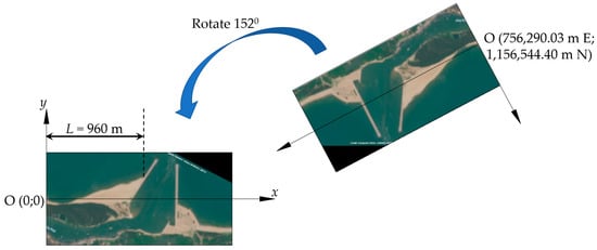 To facilitate a comparison between the shorelines extracted from Sentinel-2 images and the modeled shorelines (Equation (4)), the images were converted into local coordinates as depicted in Figure 8.