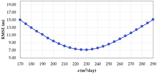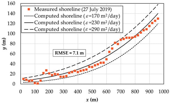 Figure 10 shows the comparison between the measured shoreline and the computed shorelines, whereby the measured shoreline is extracted from the Sentinel-2 image captured on 27 July 2019, and the computed shorelines were obtained using Equation (4). As illustrated in Figure 10, several values of ε were used in the calculations, and a value of ε = 230 m2/day demonstrates good agreement with the measured shoreline. Furthermore, the RMSE values presented in Figure 11 confirm that the best value of ε is 230 m2/day.