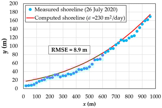 In order to clarify the suitability of Equation (4) for solving the problem at the Loc An sand spit, the model was applied with another period while still keeping the values of ε = 230 m2/day and θ = 18 degrees. At this stage, the shoreline position on 26 July 2020 was used. Hence, the modeling time is determined as the duration between 31 August 2017 and 26 July 2020, or t = 2.9 years. The validation results are shown in Figure 12. It can be seen that the RMSE in the validation step is 8.9 m which is quite close to the RMSE in the calibration step. This indicates the good performance of the model.