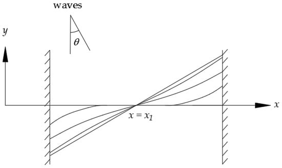 As illustrated in Figure 4c (Stage 3), the shoreline evolution at this stage is influenced by two structures: the jetties and the seawall. Equation (4) was no longer valid and a new analytical solution had to be employed as in the study of []. Tanaka and Nadaoka (1982) [] introduced an analytical solution for shoreline evolution between the two jetties as sketched in Figure 13.
