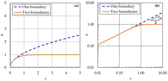 The dimensionless shoreline positions are plotted in Figure 13 with the normal axis in Figure 14a and the log-log plot in Figure 14b. As can be seen in Figure 14, in the initial stage of the shoreline evolution (τ < 0.5), there is good agreement between the shoreline positions with one boundary and two boundaries. This indicates there is no effect of the second boundary (the seawall in the case of Loc An beach). However, for τ > 0.5, there is a significant gap between the shoreline positions of one boundary and two boundaries, indicating that the longshore sediment transport has reached the second boundary and the shoreline changes were affected by it. It is also observed from Figure 14 that after τ = 2.0, the shoreline position affected by two boundaries will reach the equilibrium condition, as indicated by a horizontal line. This phenomenon is similar to the study of Duy et al. [].