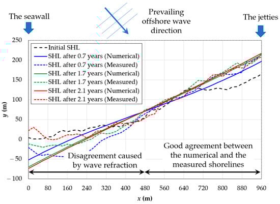 The comparison between the modeled shorelines and the measured shorelines is shown in Figure 16. In this figure, the modeled shorelines were obtained from the numerical model by discretizing Equation (6). The measured shorelines were extracted from Sentinel-2 images. It should be noted that the shoreline positions presented in Figure 16 were transformed to local coordinates (Figure 8). The locations of the seawall and the jetties, as well as the direction of prevailing offshore waves, are also presented in Figure 16. Interestingly, the shoreline position appears to be stable after 2 years of the seawall’s construction, especially at the location close to the jetties. This shows the effectiveness of the seawall in stabilizing the shoreline along the Loc An sand spit. At the location down-drift of the seawall, a disagreement between the modeled and measured shorelines can be observed, which is attributed to the buildup of the shoreline. This discrepancy is caused by wave refraction, which was not considered in the numerical model.
