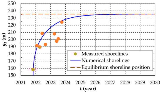 The evolution of the shoreline at the jetties (x = 960 m) is plotted in Figure 17 to highlight the equilibrium of the shoreline achieved some time after the construction of the seawall (see Figure 6 for a graphical illustration of y1). In this Figure, the numerical shorelines are represented by a blue line, and the measured shoreline positions are denoted by circles. Although there are fluctuations in the measured shorelines, they follow the trend of the numerical calculations. The numerical results predict that, after 4 years of the seawall’s construction, the shoreline at the Loc An sand spit will stabilize. This underscores the effectiveness of the seawall.
