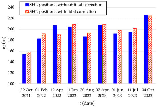 As shown in Figure 2, the tidal range is approximately 3 m, which can significantly affect the shoreline position as determined from satellite images. Consequently, a detailed discussion of the impact of tides on shoreline shifting would be useful. Figure 18 illustrates the shoreline positions at the jetties (y1) before and after tidal corrections are applied. It is evident that the maximum shoreline shift due to tidal effects at the Loc An river mouth is approximately 20 m (on 12 April 2022).