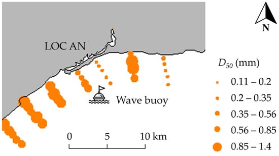 According to a survey map from Duc Anh (2021) [], the median grain size of sand in the study area (Loc An sand spit) ranges from 0.56 to 0.85 mm (Figure 19). By taking the interval of 0.05 mm between 0.56 mm and 0.85 mm, the values of K can be determined as in Table 4.