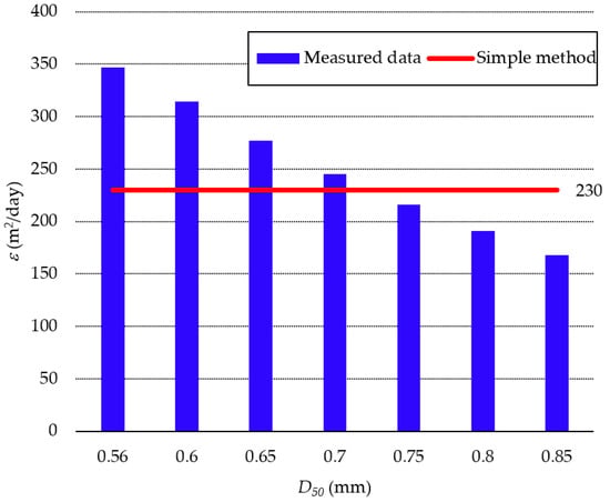 Figure 20 shows the comparison between the values of ε calculated by two methods. The blue bars represent the variation of ε calculated by Equation (5) based on measured data, while the red line shows the value of ε determined by the simple method (see Figure 11). The result from the simple method falls within the upper and lower bounds of the ε value range. Hence, the simple method can determine the value of ε in cases of data scarcity.