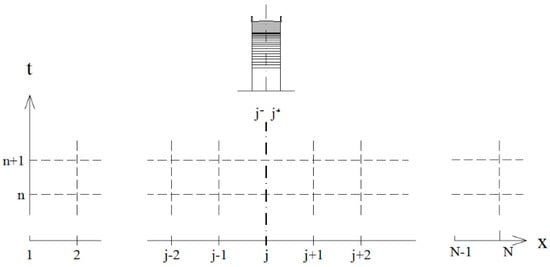 The solution at cross-sections j − 1–j− and j+–j + 1 is evaluated by coupling the IBC model (at sections j+ or j−) with the mass balance equation solved with the Roe scheme.