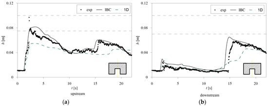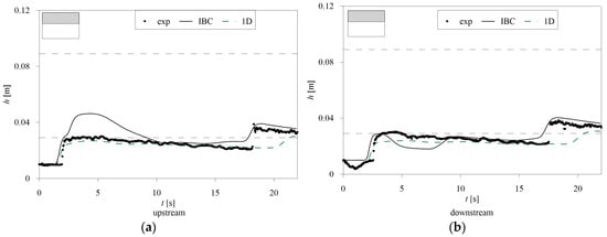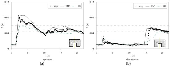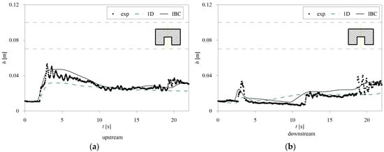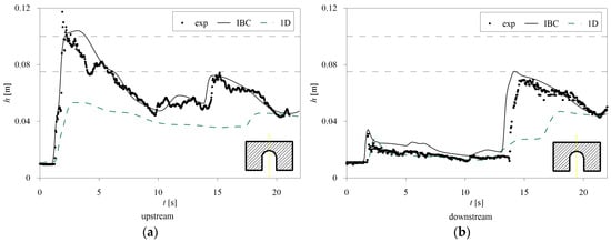 Figure 7 and Figure 8 show an overestimation of the maximum water level by the IBC model in the upstream cross-section, while for the downstream one, both the main peak and the reflection wave are well simulated.