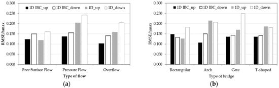 The relative RMSE is then computed considering groups of tests with the same type of flow or the same type of bridge. Figure 9a shows that the relative RMSE for the 1D IBC model is similar for the three types of flow observed in the experiments, with the Overflow tests presenting an overall average slightly lower than the other two flow types for the upstream and downstream cross-sections. For the standard 1D model, Pressure Flow presents the highest values of the relative RMSE, while Free Surface Flow tests present an accuracy near the one of the IBC model. For the 1D IBC model, if the average percentage RMSE is computed according to the bridge type (Figure 9b), the Arch ones present smaller errors in the upstream cross-section and the largest differences between the upstream and the downstream values. For the same model, Gates and T-shaped bridges have similar accuracy upstream and downstream of the structure. The results are different for the standard 1D model, which presents the largest difference between upstream and downstream for Rectangular and Gate types, while Arch and T-shaped bridge types have similar errors, although larger than the 1D IBC model.