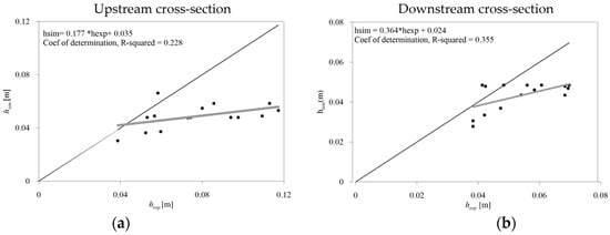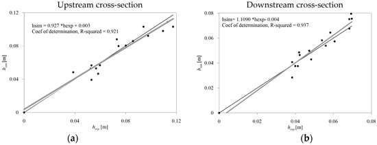 Figure 10 shows the comparison between experimental and simulated maximum water depths. The black line refers to the perfect agreement. Adequate agreement is found for the IBC model, both in the upstream and in the downstream cross-section, since the angular coefficient of the regression curve is very close to 1, and the determination coefficient R2 is higher than 0.9 in both cases.
