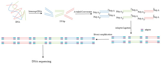 The qualified DNA samples were used to construct a DNA library by using the ALFA-SEQ DNA Library Prep Kit (FINDROP, Guangzhou, China). The DNA was randomly interrupted into 350 bp fragments after adding fragment buffer using Covaris R230 (Covaris, Woburn, MA, USA). The fragments were used to build libraries after A-tailed conversion, adapter ligation, post-ligation cleanup, library amplification, and post-PCR cleanup. The diagram was shown in Figure 2. Approximately 15 Gb of sequencing data were sequenced from every DNA sample.