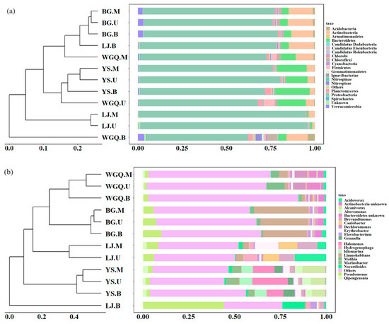 Based on Bray–Curtis distance, the clustering tree was drawn, and the bar graph displayed the similarities and differences in bacteria composition among samples at phylum (Figure 3a), class (Figure S1a), genus (Figure 3b), and species (Figure S1b) levels. In the BG and YS sites, different layer samples were grouped together, indicating that there is no significant difference in bacteria composition in different layers of the BG and YS sites at the phylum (Figure 3a), class (Figure S1a), genus (Figure 3b), and species (Figure S1b) levels. Instead, different layer samples were not gathered together at different levels in the WGQ and LJ sites, indicating that depth might affect the composition of bacterial communities in the limited water depth of ports.