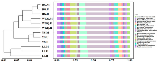 The annotation of pathogens was obtained by comparing clean data with the PHI database. A total of 215 pathogens were identified from all samples, and the number of pathogens varied at four sites. The number of pathogens at the BG (209) site was less than WGQ (215), LJ (214), and YS (214) sites. However, the composition of pathogens showed no significant difference among different sites and different layers according to the Bray–Curtis distance of the bar graph (Figure 4). The result of NMDS (Figure S2b) was consistent with clustering results. This result differed from the clustering results of bacteria, indicating that pathogens were not completely correlated with bacteria community composition at the same site. The dominant pathogens were Pseudomonas aeruginosa (9.59%), Salmonella enterica (8.01%), Xanthomonas oryzae (4.97%), Staphylococcus aureus (4.79%), and Escherichia coli (4.65%). Except for Xanthomonas oryzae, the other four dominant pathogens could infect human beings. Furthermore, Gammaproteobacteria occupied an important place in pathogens, and seven pathogens belonged to Gammaproteobacteria among the top 20 pathogens (Figure 4).