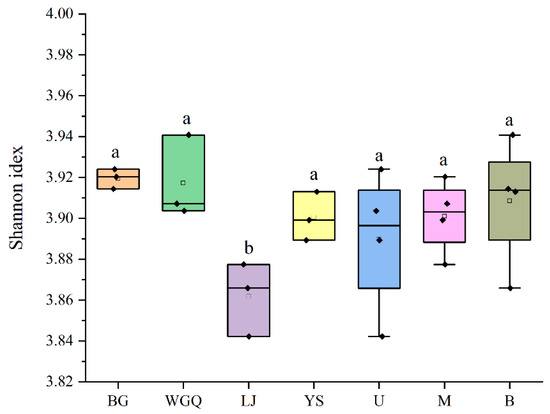 Alpha diversity index of the pathogen community. The letters “a” and “b” represent that there is a significant difference between the two groups, and the same letter means that the difference is not significant.