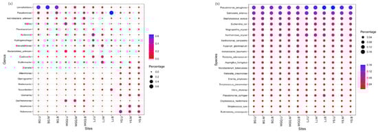 Bubble charts represent the annotation and abundance of species through the change in bubbles’ size and color. In this study, the species of bacteria and pathogens that could be biomarkers in different sites were identified by the top 20 at genus and species level, respectively (Figure 6). In BG site samples, significant enrichment was observed for the Limnohabitans sp. belonging to the Betaproteobacteria class. In WGQ site samples, an obvious accumulation was noted for Dechloromonas sp. and Malikia sp. belonging to the Betaproteobacteria class. In LJ site samples, Pseudomonas, Acidovorax sp., and Brevundimonas sp. could be served as belonging to the Gammaproteobacteria, Betaproteobacteria, and Alphaproteobacteria, respectively. In YS site samples, Halomonas sp. and Alcanivorax sp. belonging to the Gammaproteobacteria were a clear aggregation (Figure 6a). Furthermore, no bacteria were found as candidate indicators in the same water layer at different sites. However, as a pathogen, Pseudomonas aeruginosa and Salmonella enterica could be regarded as candidate indicators in different layers at four sites due to their high abundance belonging to the Gammaproteobacteria and Enterobacteriaceae, respectively (Figure 6b).