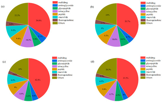 The ARGs were identified through comparing clean data with the ARDB database. A total of 2359 ARGs and 33 ARG types were detected in all samples, and the number of ARGs was different in BG (2194), WGQ (2287), LJ (2160), and YS (2201) sites. The number of ARGs was not significantly different in the U (2310), M (2310), and B (2316) layers. ARGs were classified according to the type of antibiotic resistance, and the dominant ARG types were similar in different sites (Figure 7). The main types of ARGs detected were multidrug (34.64%), tetracycline (10.16%), peptide (9.36%), macrolide (9.06%), glycopeptide (5.88%), aminoglycoside (5.11%), and fluoroquinolone (3.60%) in BG (Figure 7a). Furthermore, the multidrug ARGs (35.2% vs. 41.8%) of BG and WGQ were significantly lower than LJ and YS, and tetracycline ARGs (10.4% vs. 8.8%) showed the opposite trend.