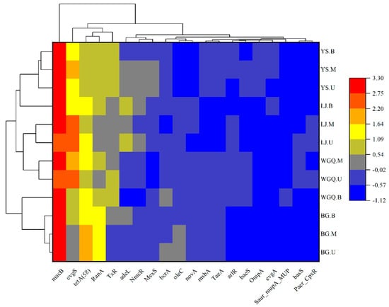 The top 20 ARGs were selected to analyze the clustering heatmap according to their relative abundances (Figure 8). The macB showed a trend of prevalence, and tetA (58) also occupied a high percentage of ARGs in all samples. Except for BG.U, other samples showed a high relative abundance of evgS. The results showed that the dominant ARGs at different sites were similar in all samples.