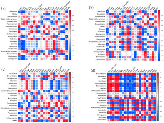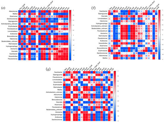 As the dominant genus of BG, Limnohabitans sp. has often been detected in rivers and lakes in previous studies and is considered a dominant group of freshwater planktonic bacteria worldwide [43]. Dechloromonas sp. and Malikia sp. were abundant bacteria genera at WGQ. Dechloromonas sp. played an important role in the degradation process of organic matter in wastewater environments [44] and the removal of phosphorus and nitrogen [45]. Furthermore, Malikia sp. was significantly associated with the concentration of wastewater and linked with denitrification and nitrogen fixation [46]. The high abundance of Dechloromonas sp. and Malikia sp. indicated that WGQ might be severely polluted by nitrogen and phosphorus pollution. Acidovorax sp., Erythrobacter sp., and Pseudomonas sp. were the main components of LJ U, M, and B, respectively. As an aerobic denitrifying bacterium, Pseudomonas sp. was closely related to nitrogen metabolism by converting nitrate into gaseous nitrogen [47]. Furthermore, Acidovorax sp. had remarkable gene expression about the nitrogen metabolism pathway in a polluted basin based on gene expression [48]. Erythrobacter sp. had a strong ability to degrade polycyclic aromatic hydrocarbons [49], and its abundance is significantly correlated with the concentration of low-molecular-weight polycyclic aromatic hydrocarbons [50]. As the concentration of low molecular weight polycyclic aromatic hydrocarbons in the environment increases, the abundance of Erythrobacter sp. also increases [50]. It shows that LJ might be polluted by nitrogen and polycyclic aromatic hydrocarbons. Halomonas sp. and Alcanivorax sp. were the main genera of YS, and Alcanivorax sp. was always detected in environments related to hydrocarbon exposure [51,52]. Halomonas sp. and Alcanivorax sp. could effectively degrade hydrocarbons and their derivatives [53,54]. As the quality of the water environment improves, the abundance of Halomonas sp. also increases [55]. It showed that the water environment may have been contaminated with hydrocarbons before, and it has now improved at the YS site. Overall, the analysis of bacteria composition indicated that different sites are affected by different types of pollution, which may be due to the different functions of different sites and the frequency of human activities [56].