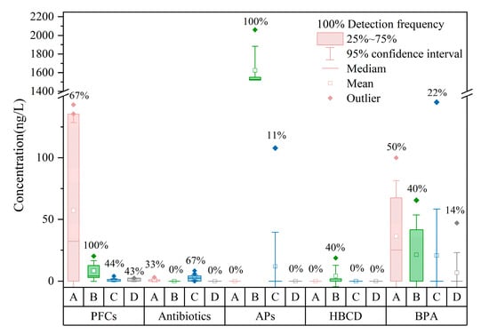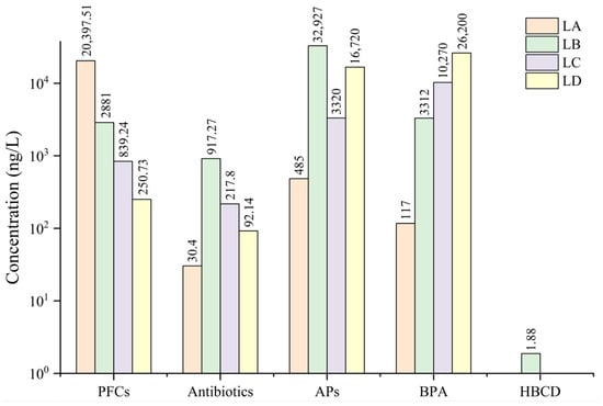 The rank of different types of PFCs detected in LL according to concentration was: LA (20,237.51 ng/L) > LB (2881 ng/L) > LC (839.24 ng/L) > LD (250.73 ng/L); that of antibiotics was: LB (917.27 ng/L) > LC (217.8 ng/L) > LD (92.14 ng/L) > LA (30.4 ng/L); that of APs was: LB (32,927 ng/L) > LD (16,720 ng/L) > LC (3320 ing/L) > LA (485 ng/L); that of BPA was: LD (26,200 ng/L) > LC (10,270 ng/L) > LB (3312 ng/L) > LA (117 ng/L). HBCD was detected only in Landfill B at a concentration of 1.88 ng/L.