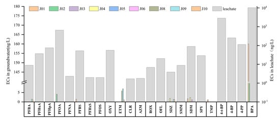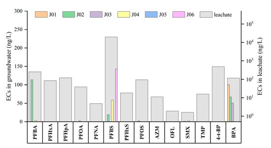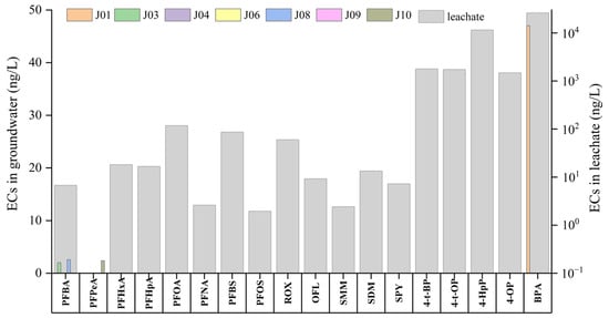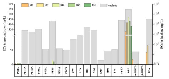 The rank of ECs according to frequency of detection in groundwater at Landfill A was: PFCs (67%) > BPA (50%) > antibiotics (33%); the remaining ECs were not detected. PFCs were the most abundant ECs in groundwater (ND–143 ng/L), followed by BPA at a maximum concentration of 100 ng/L.