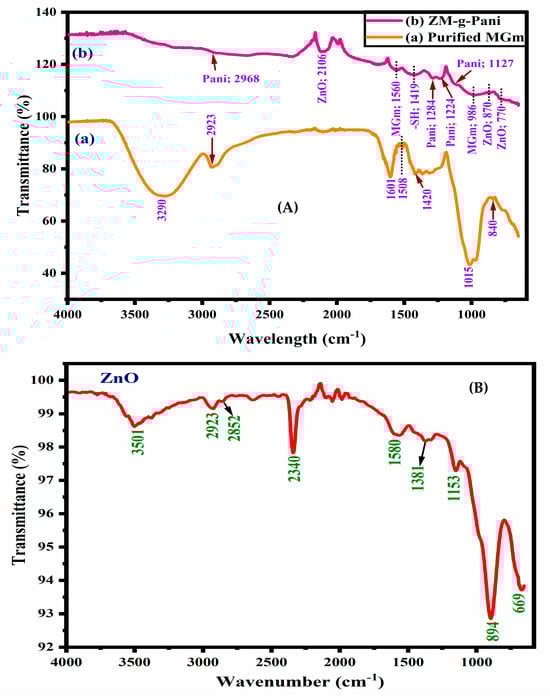 FT-IR spectra of (A) purified MGm (a) and ZM-g-Pani bionanocomposites (b); (B) ZnO NPs.