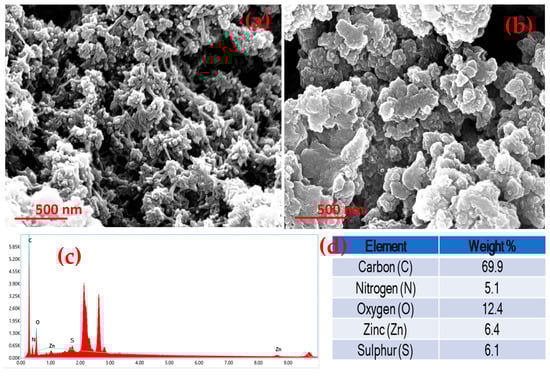 In a typical FE-SEM study, a spike-like morphology in ZM-g-Pani bionanocomposites has been observed, as shown in Figure 2a. Such a type of morphology may increase the surface area of ZM-g-Pani bionanocomposites, ultimately enhancing the adsorption capacity of an adsorbent material. The micrograph of the ZM-g-Pani nanocomposite shows highly clustered granular particles. The clustering of the particles means that they are firmly coupled to one another and that they have enough binding energy to unite with nearby molecules. In addition, the FE-SEM micrograph of ZM-g-Pani also shows some small and larger pores and cavities, which may be due to the functionalization of amino acid, i.e., L-methionine [27,31], hence facilitating extra active sites to adsorb water pollutants. Moreover, the FE-SEM studies also indicated that the ZM-g-Pani nanocomposite has a porous structure. This porosity enhances the diffusion of metal ions into the internal structure of the adsorbent, promoting both physical sorption (due to the porous network) and chemisorption (through reactive sites within the pores). Figure 2c shows the EDS spectrum of the ZM-g-Pani ternary system, which reveals that the composite is mainly composed of C, N, O, Zn, and S. The appearance of sulfur confirms the presence of L-methionine grafted Pani in the composite.
